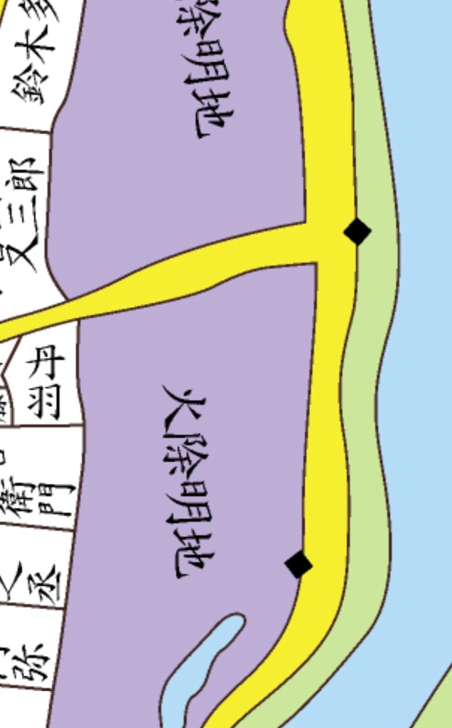 NOTE: While the term hiyokechi today is an anachronism, another fire fighting measure’s name survives in place names today. Hirokōji ‘wide streets’ were broad avenues carved through congested urban areas to link up vital points with strict easement rules to control encroachment on the avenue / fire break and to facilitate official and fire fighting traffic in an emergency.