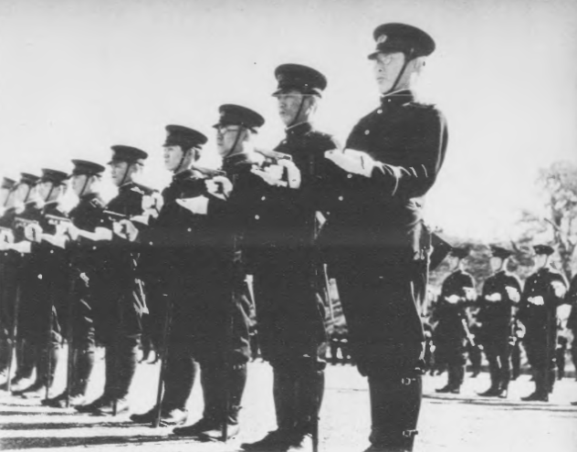 Tokyo Metropolitan Police Special Force circa 1938, a unit trained in jō by Shimizu Takaji sensei, was a forerunner of today’s Kidōtai Mobile Units. While difficult to see against their dark uniforms, each officer has a jō standing alongside his left leg as they display their pistols for inspection. Source: Wiki Commons / public domain.